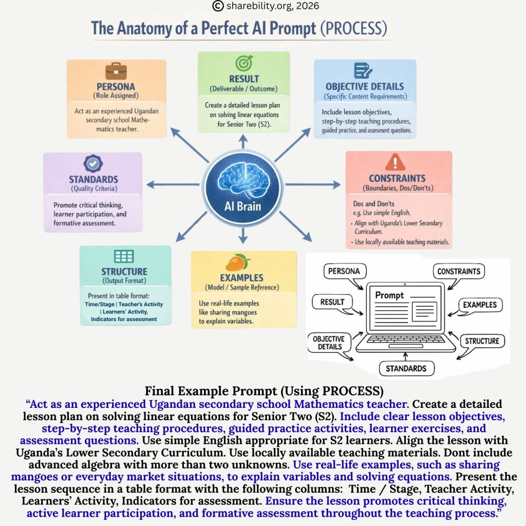Developed as an original tool to empower teachers, especially in contexts like Uganda’s education system where resources may be limited, PROCESS stands for Persona, Result, Objective Details, Standards, Constraints, Structure, and Examples. It builds on established prompting best practices, such as those outlined in frameworks like CARE (Context, Ask, Rules, Examples) or the Atlassian guide‘s emphasis on Persona, Task, Context, and Format, but expands them into a holistic acronym that’s easy to remember and apply. By following PROCESS, educators can generate materials that align with curricula, promote critical thinking, and incorporate real-life relevance, all while ensuring ethical use.